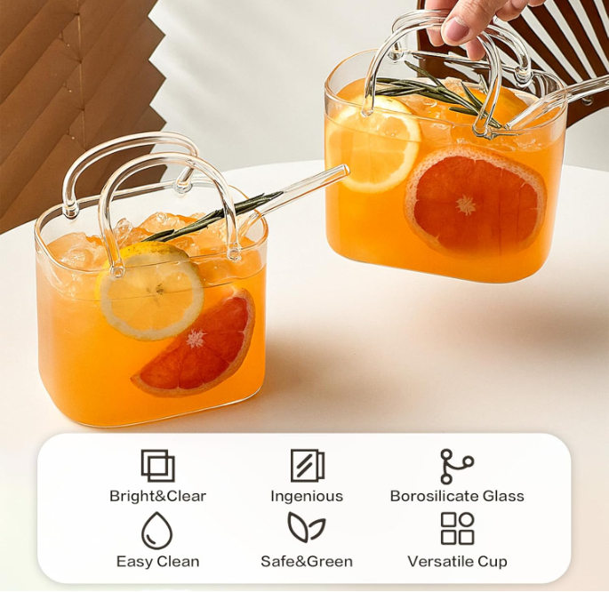 Crafted from food-grade high-borosilicate glass 🧪, this purse-shaped cup set boasts exceptional clarity, heat resistance, and durability. The seamless, hand-blown design delivers a crystal-clear, glossy finish that catches light beautifully, elevating any table setting with a touch of luxury 🏆.