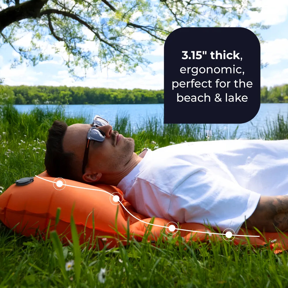 With an ergonomic design, 3 inches of cushioned air support, and a soft-touch fabric finish, this pad molds perfectly to your back, neck and spine - giving you next level comfort anywhere you lay. Say goodbye to sore pressure points and hips hitting the ground. Whether you're on grass, gravel, or rocky terrain, it feels just like your bed at home. Incredibly supportive, right where you need it.