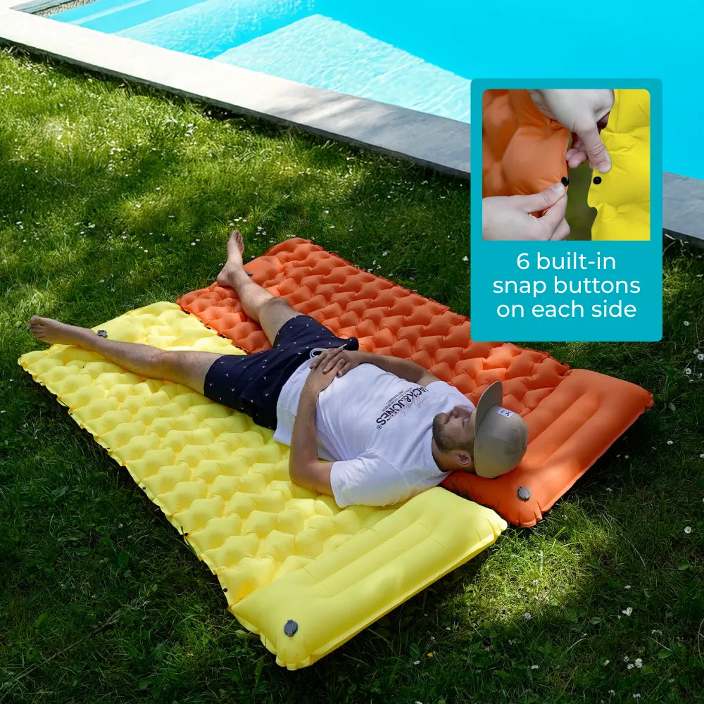 Snap buttons on both sides let you easily connect multiple pads to create a huge, seamless lounging area - perfect for couples, groups, of family time. No slipping, no gaps - just snap together and stretch out. Whether you're lakeside, at a campsite, or in your backyard, the more mats you link, the more space you get to relax. Your comfort zone just keeps growing.