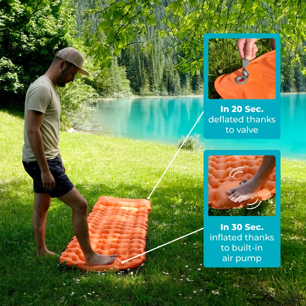 This sleeping pad is built for anyone who craves simplicity, comfort, and zero hassle. With its integrated air pump, it's fully inflated in just 30 seconds - no mouth blowing, no extra pump, no effort. Ready to pack up? The oversized air release valve deflates it in seconds, so you can roll it up and stash it away in just 20 seconds. No stress, no mess - just ease and efficiency. That leaves you more time for what really matters: enjoying the outdoors.