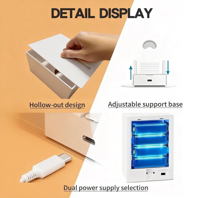 Power options: Type-C rechargeable (cable included) OR 4 x AA batteries (not included)