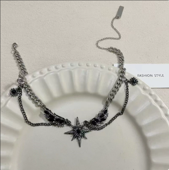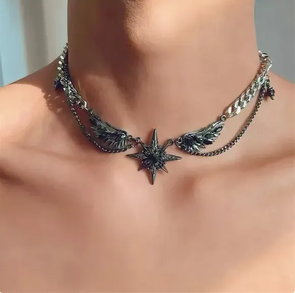 Evoking the mystique of midnight skies, this choker features symmetrical wing motifs framing a radiant star pendant 🌌. The mix of chunky curb chains and fine bead chains creates textural contrast, embodying a modern, dark romanticism that’s both bold and ethereal.