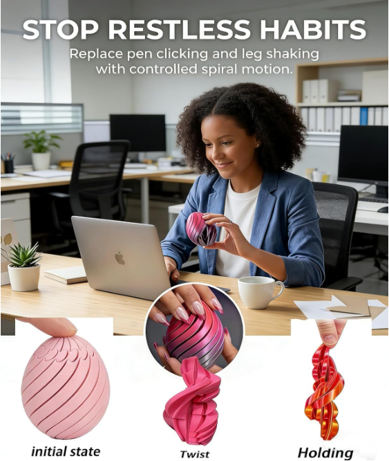 Swap pen-clicking and leg-shaking for intentional, rhythmic movement. Each twist of the spiral creates a satisfying, almost meditative rhythm, making it an elegant antidote to screen fatigue and workplace restlessness.
